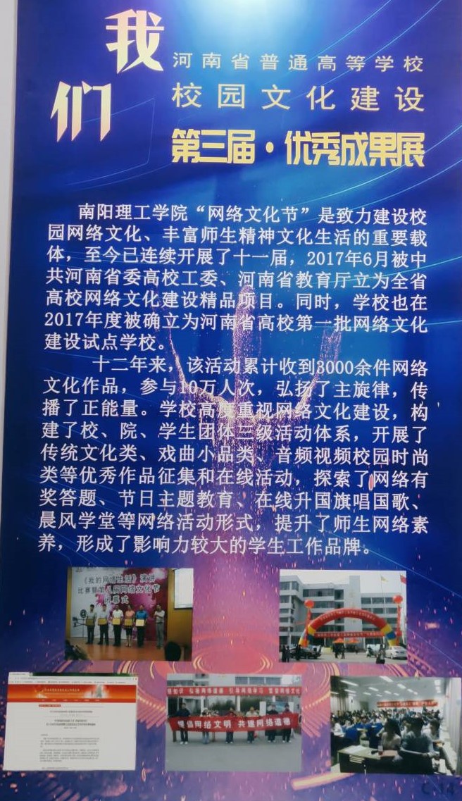 南阳理工学院在此次校园文化建设优秀成果展中以开展校园“网络文化节”优秀活动项目荣获三等奖,很好的体现了南阳理工学院注重校园文化建设,充分展现了南阳理工学院在校园文化建设工作取得的丰硕成果,有助于提高南阳理工学院知名度和学子们的认同感,更好的发展网络育人的功能,在让“南工学子”体会到南阳理工学院优秀的网络文化实力的同时给南阳理工学院未来不断增强网络文化实力打下良好的基础。