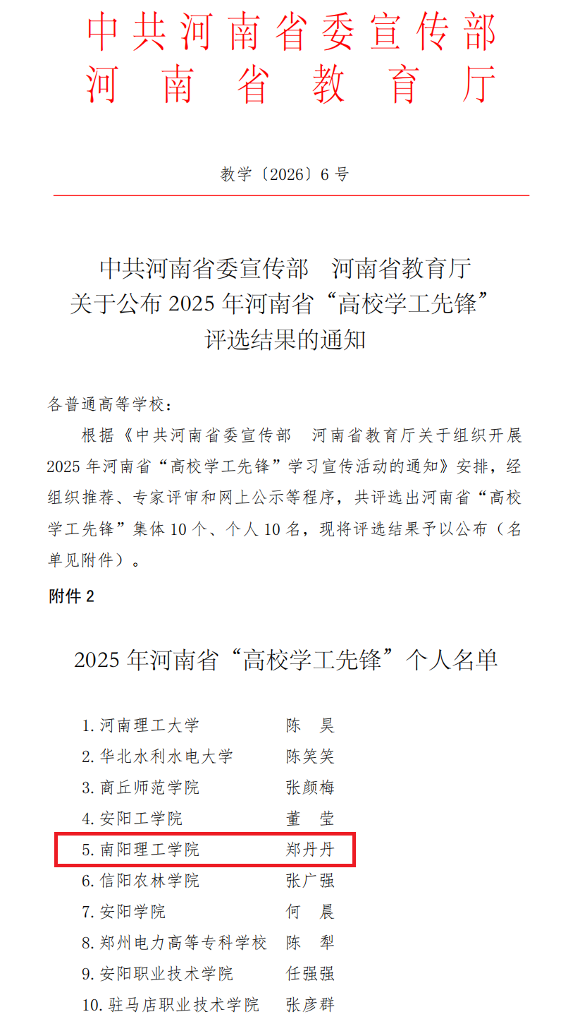 (特约记者/黄晨)近日,中共河南省委宣传部、河南省教育厅联合下发《关于公布2025年河南省“高校学工先锋”评选结果的通知》(教学〔2026〕6号),我校传媒学院辅导员郑丹丹凭借全面过硬的业务素质和工作成效,经学校推荐、现场答辩、实地考察等环节,荣获河南省“高校学工先锋”称号(个人)。