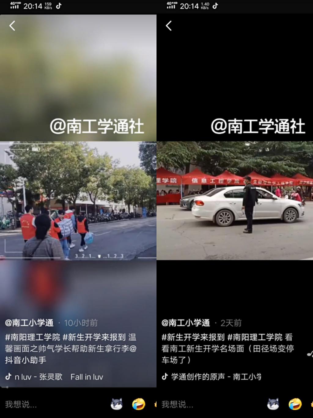 视频新闻部工作者在迎新过程中,用DV记录新生报道的各种趣事,用视频的形式记录2020级新生刚进入大学的第一天,他们白天采集视频素材,晚上整理素材,将其剪辑成短视频,发布在短视频平台上,让更多的人认识和了解南阳理工学院。