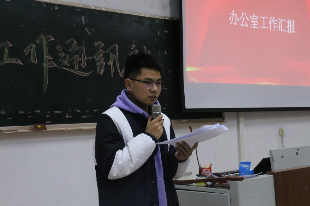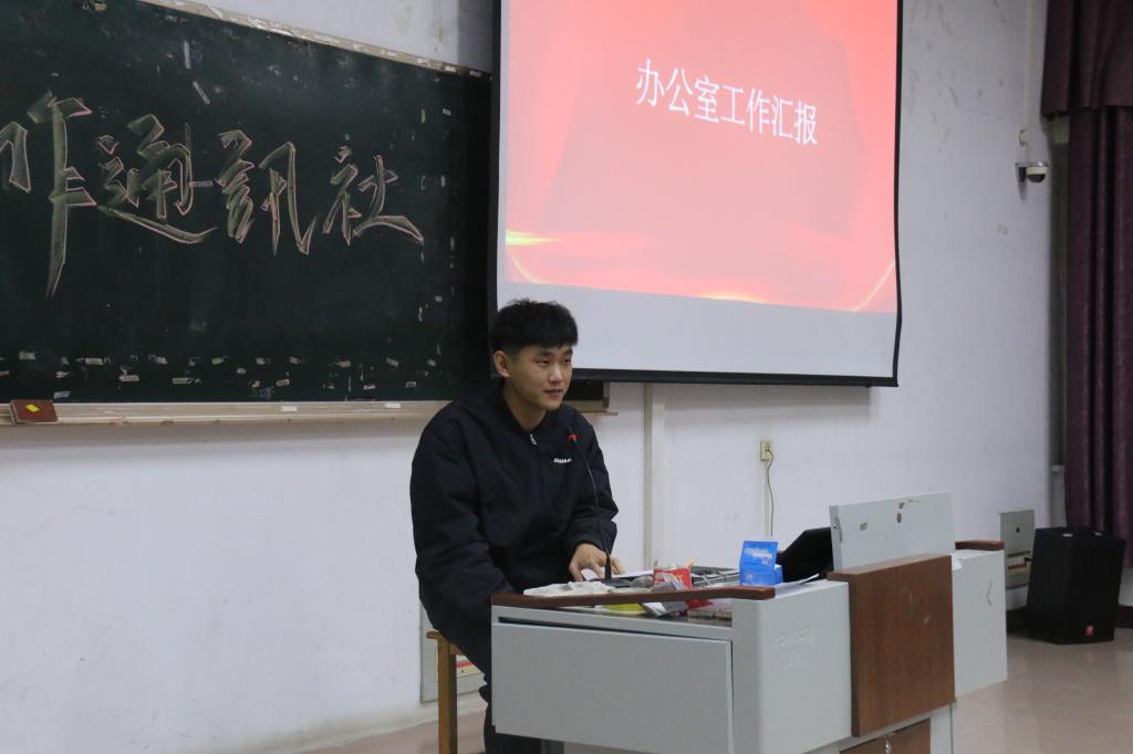 大会伊始,主持人对到场的社员们表达热烈的欢迎。大会第一项由各门负责人进行工作汇报和工作总结。办公室负责人岳新泉表示对于过去一个月中部员们连续三周签到率达到100%感到很满意,希望部员们可以再接再厉,将满签延续下去。随后,他对部员的工作流程及工作内容进行讲解,将工作中需要改进的部分提出解决方案,对即将进行的工作进行策划。