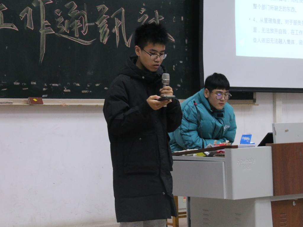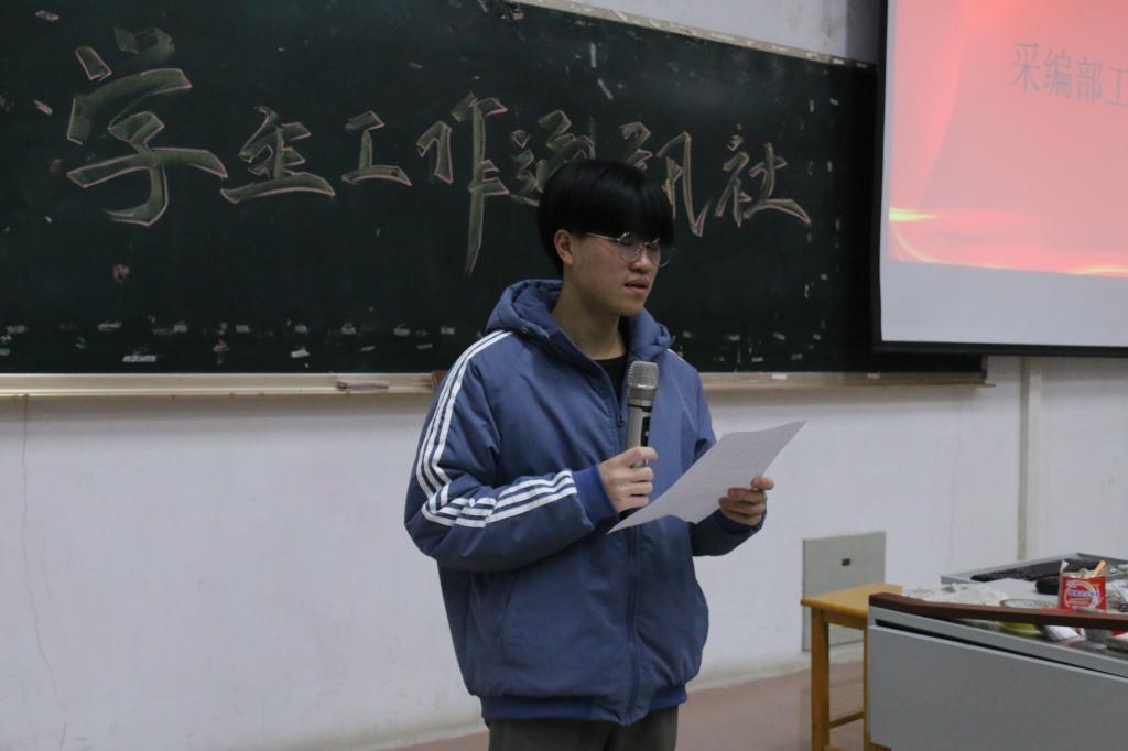 采编部负责人叶煜坤展示当前采编部所取得的一些工作成果,指出部门目前有待整改的问题并提出相应的解决办法,强调大家要在日后的活动中要积极主动报名,抓住一切机会去锻炼自己的能力,一切以提升自我为主。