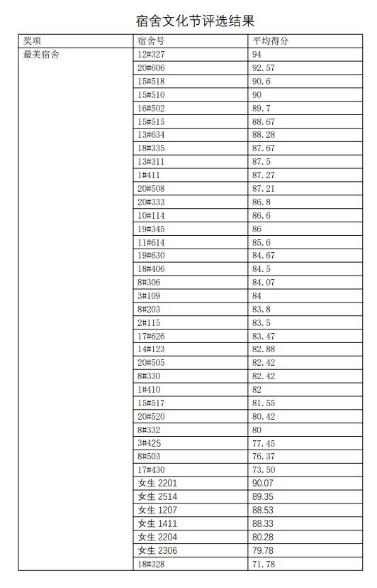 活动的初次筛选参考卫生、安全、装扮等方面的与网上投票结果,最终12#327、20#606、15#518等39个宿舍获得“最美宿舍”奖。