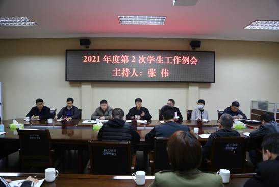 3月29日下午,校党委副书记、工会主席张伟主持召开我校2021年度第2次学生工作例会。学生处、团委、心理健康教育中心、保卫处、后勤服务中心、校医院等部门主要负责人,各教学院党委副书记参加会议。