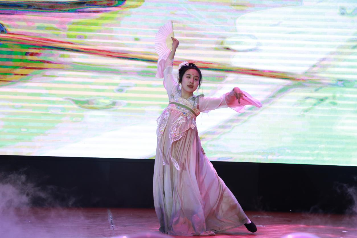 首先是杨宇飞等人带来的舞蹈《秀色》,他们曼妙的身姿将这首古典舞展现的淋漓尽致,画面典雅,音乐优美,扇子的舞动宛如百花争奇斗艳,既让我们感受到一场视觉盛宴,又让同学们了解到古典舞独有的韵味。