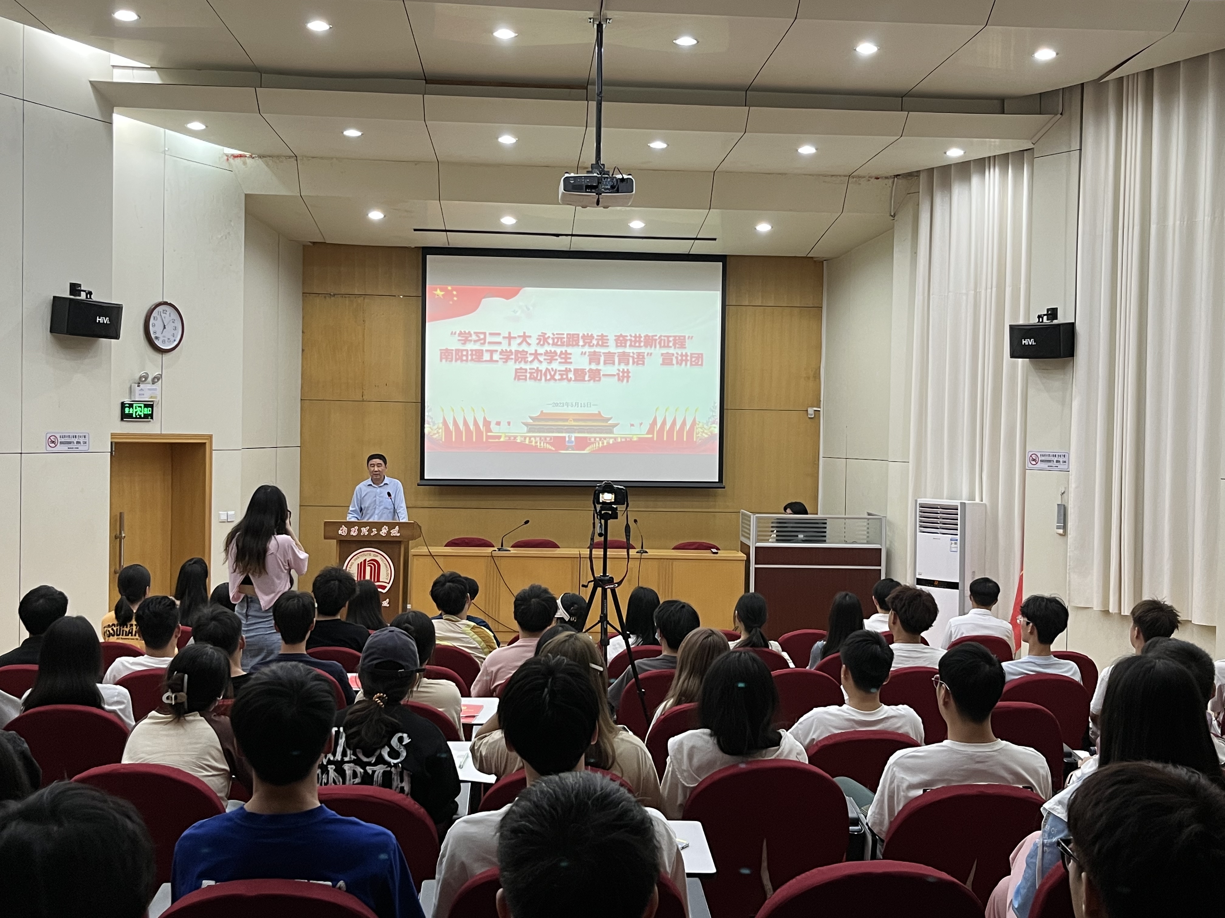 本网讯(特约记者/陈旭)为深入学习贯彻习近平新时代中国特色社会主义思想,贯彻落实《中共中央关于认真学习宣传贯彻党的二十大精神的决定》,引领广大青年坚定跟党走、建功新时代,为实现中华民族伟大复兴的中国梦凝聚起强大青春力量。5月15日晚19点,我校在中込会馆报告厅举行南阳理工学院大学生“青言青语”宣讲团启动仪式暨“学习党的二十大精神 永远跟党走 奋进新征程”主题宣讲第一讲。校党委学生工作部部长、学生处处长路瑞峰、各学院教师代表、学生代表以及“青言青语”宣讲团成员参加本次会议,会议由计算机与软件学院团学办陈旭主持。
