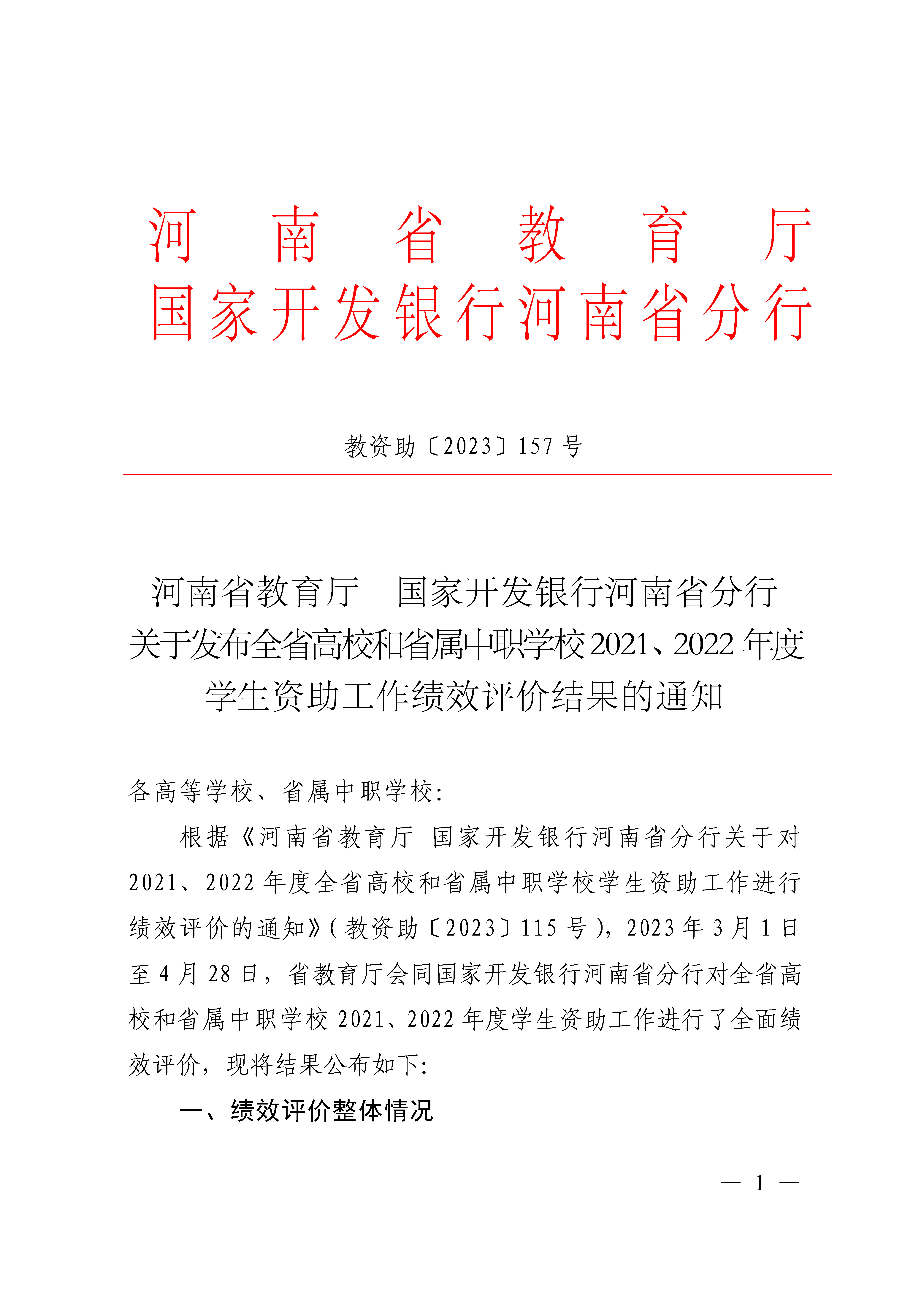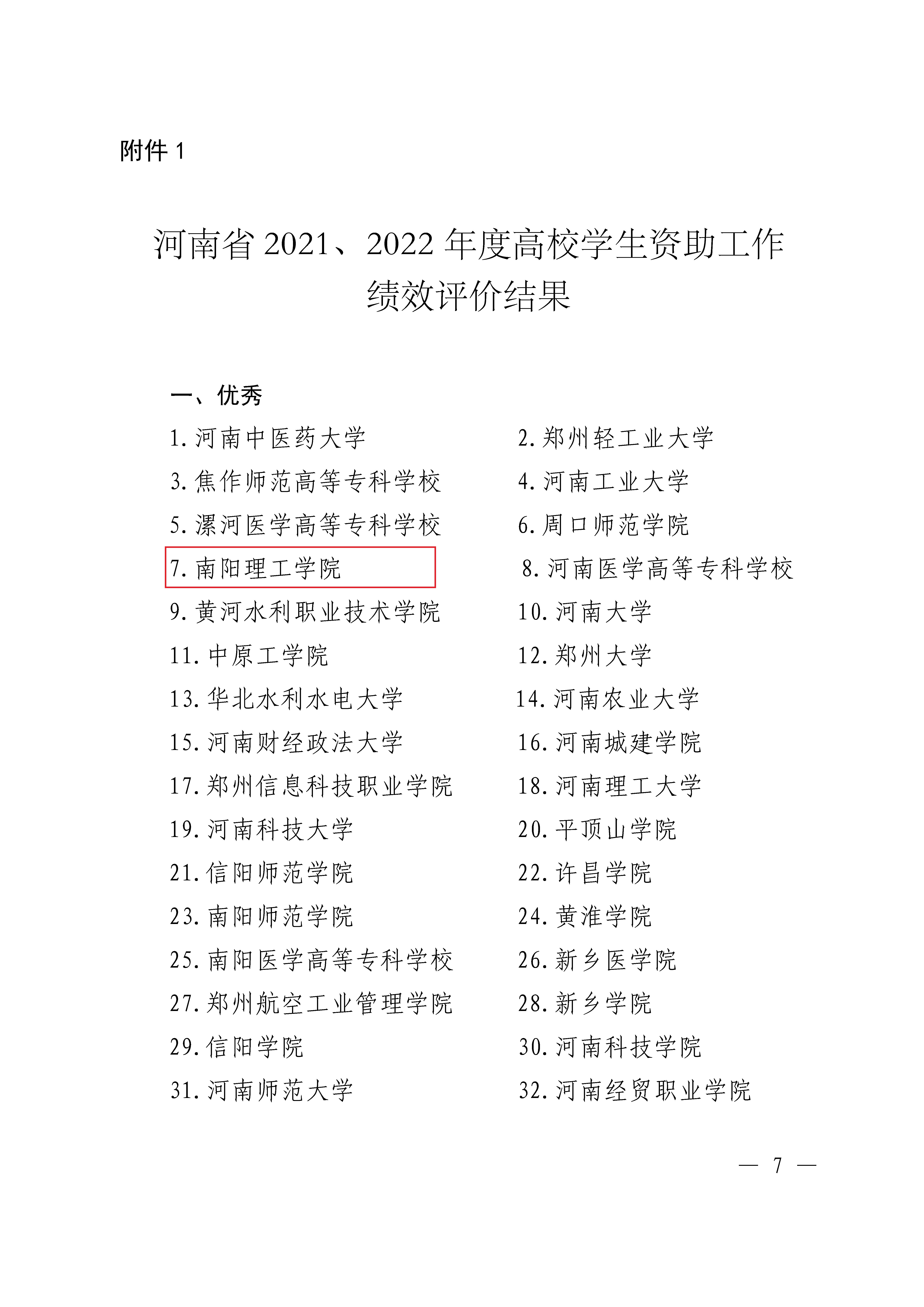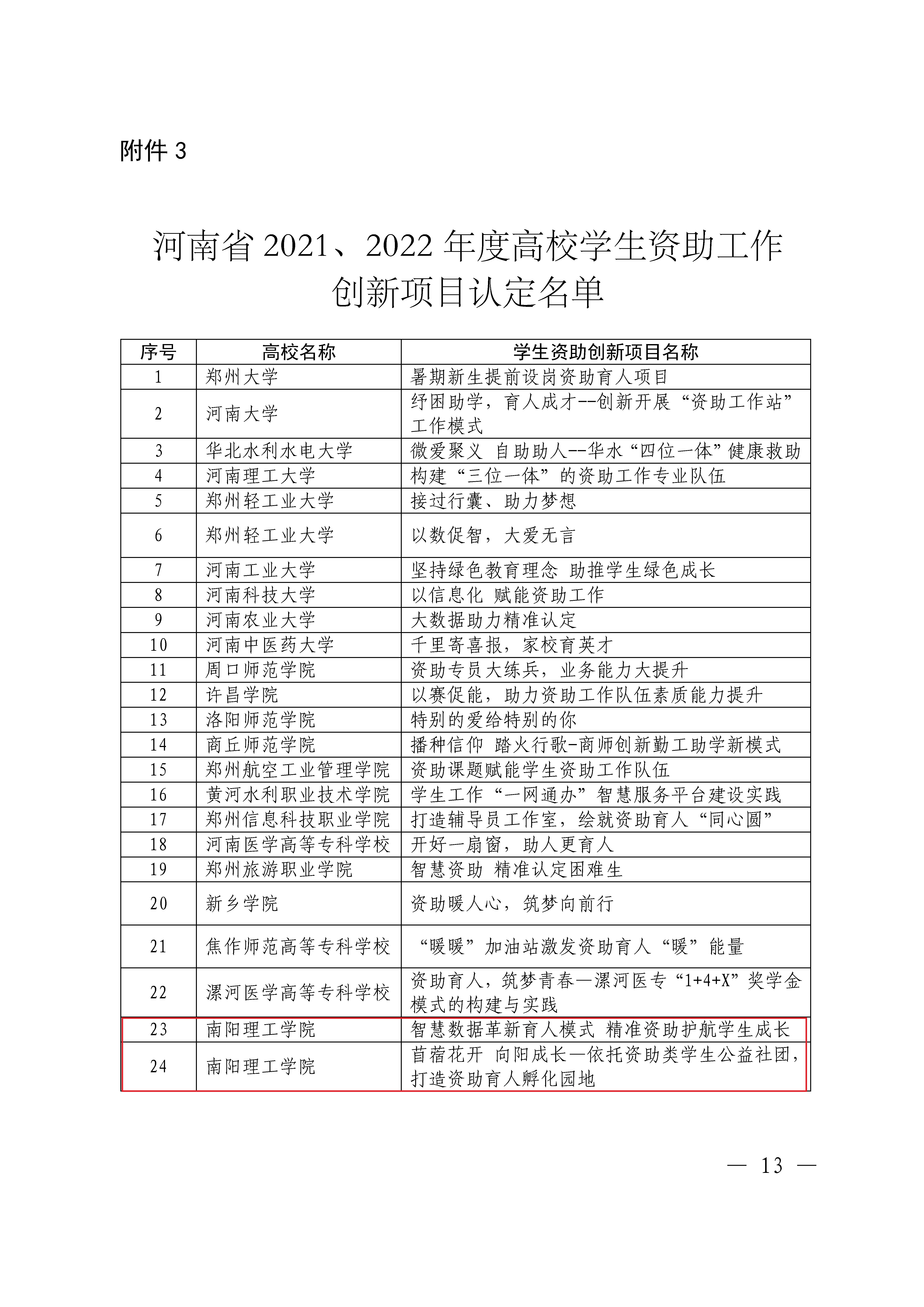 本网讯(特约记者/张卓娅 尹永娟)近日,河南省教育厅、国家开发银行河南省分行联合印发《关于发布全省高校和省属中职学校2021、2022年度学生资助工作绩效评价结果的通知》,我校成绩位列全省第七,再次被确定为优秀等级,这是自2005年开始考核以来,学校连续18年荣获“河南省高校学生资助工作绩效评价优秀”称号。同时,在河南省首届“学生资助工作创新项目”评选中,我校《智慧数据革新育人模式精准资助护航学生成长》《苜蓿花开向阳成长-依托资助类学生公益社团,打造资助育人精神孵化园地》两个项目在全省79个项目中脱颖而出,成功获评河南省学生资助工作创新项目。