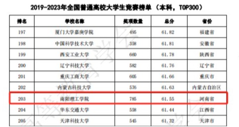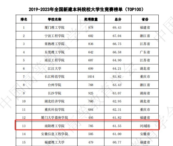 3月22日,中国高等教育学会公布《2023全国普通高校大学生竞赛分析报告》,我校在2019-2023年全国普通高校大学生竞赛榜中位居第203名,省内位居第8名;在2019-2023年全国新建本科院校大学生竞赛排行榜中位居第13名,省内位居第1名。