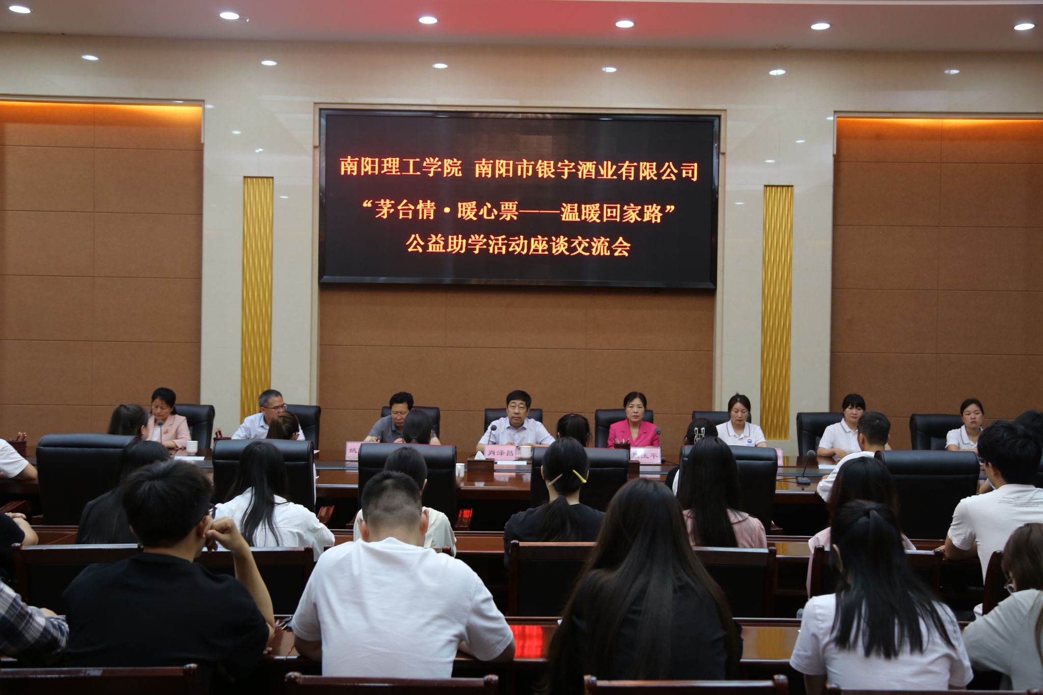 本网讯(特约记者/张鑫)5月24日上午,由我校关工委、学生资助管理中心、教育发展基金会和南阳市银宇酒业有限公司联合举办的“茅台情·暖心票——温暖回家路”公益助学活动座谈交流会在会议中心成功举行。我校关工委执行主任、原副校长肖泽昌,南阳市银宇酒业有限公司董事长周玉平,学生资助管理中心、教育发展基金会主要负责人,各教学院资助专干老师以及受资助学生代表参加座谈。