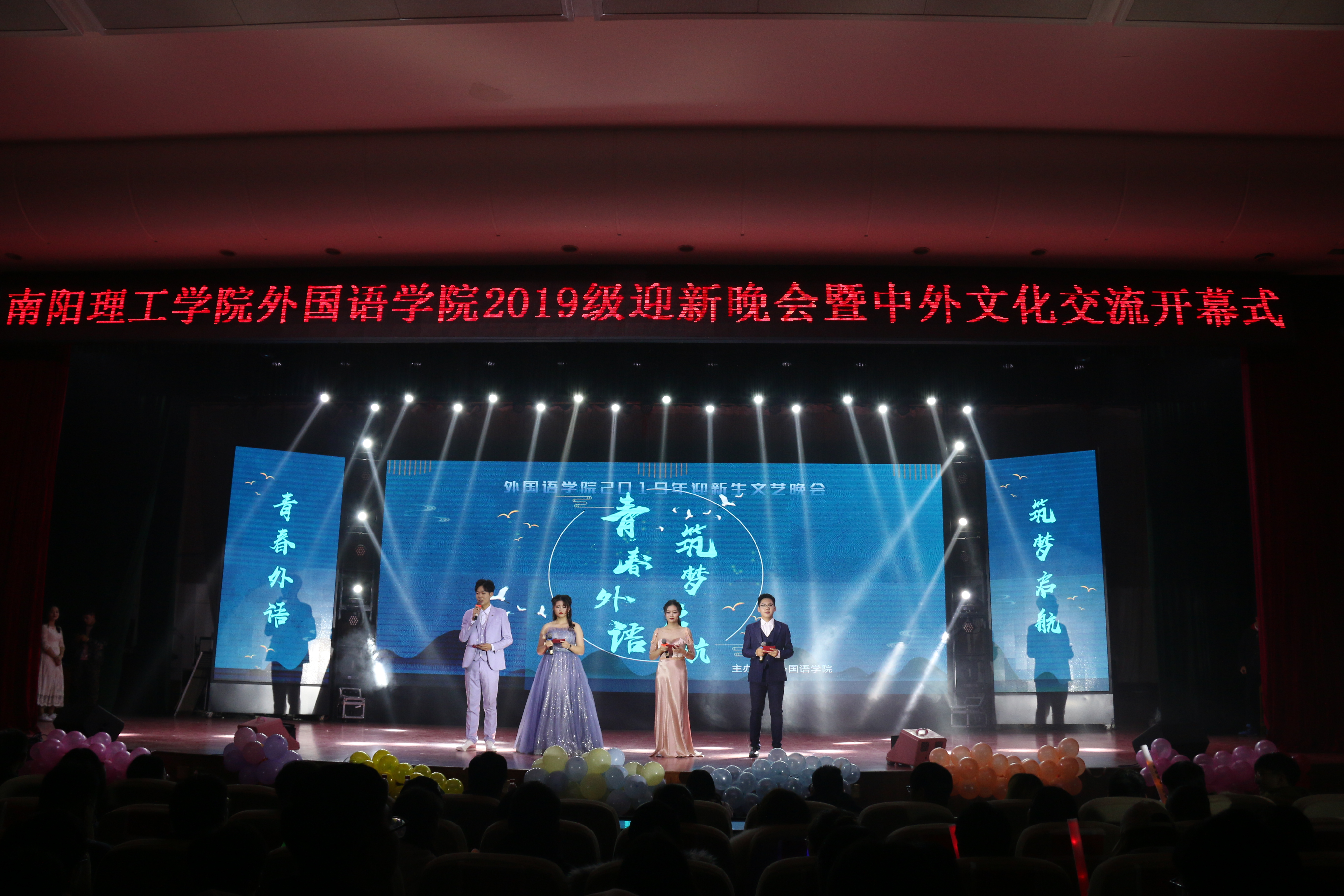 本网讯(学生记者/李静娴 石海洋 校对/魏凯瑞)11月28日,由外国语学院主办的以“青春外语,筑梦启航”为主题的外国语学院2019年迎新晚会暨中外文化交流开幕式于音乐厅顺利举行。外国语学院党总支书记闫合战、团学办主任李爽正、办公室组织员张莎及其他老师同八百余名同学共同观看了本次晚会。
