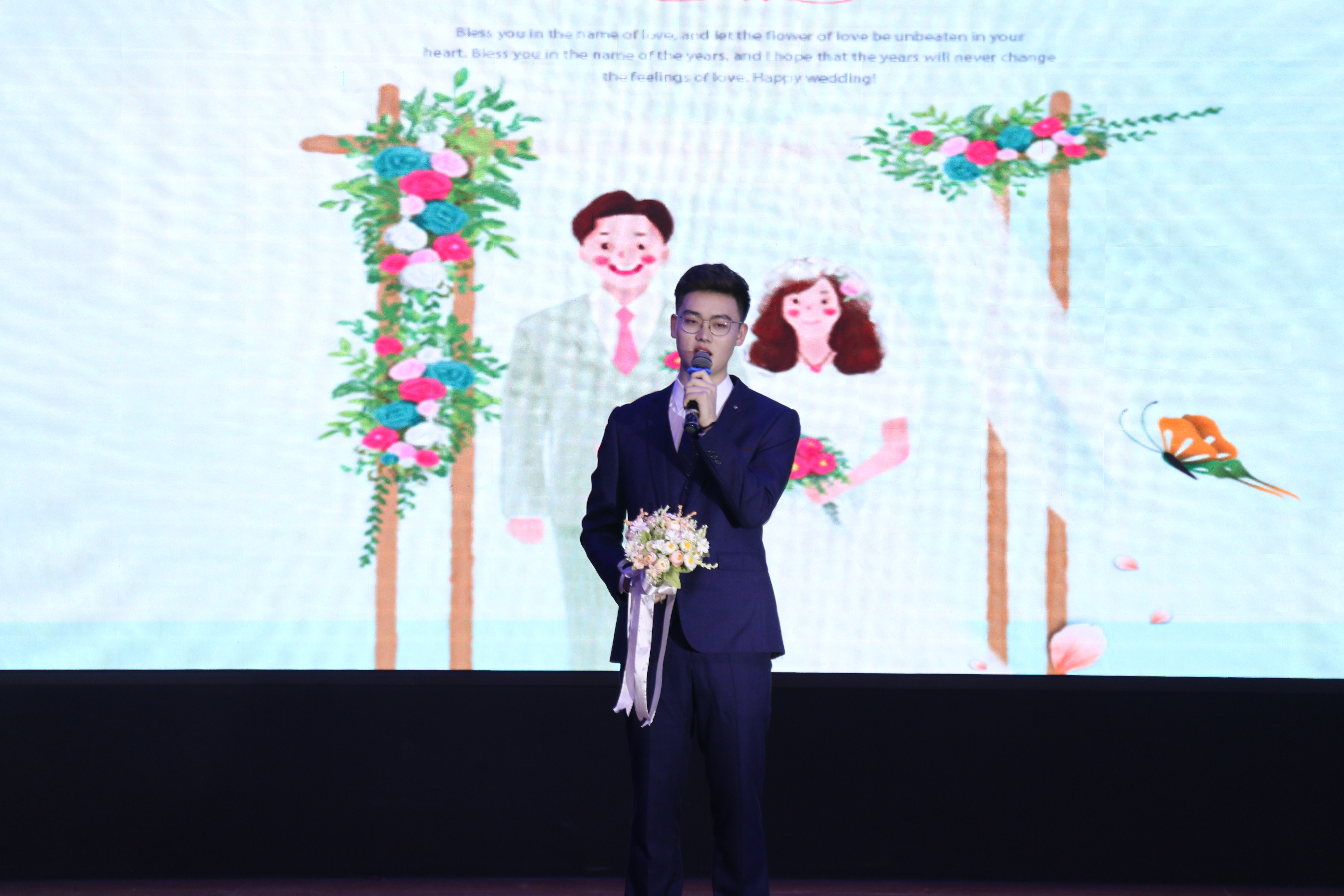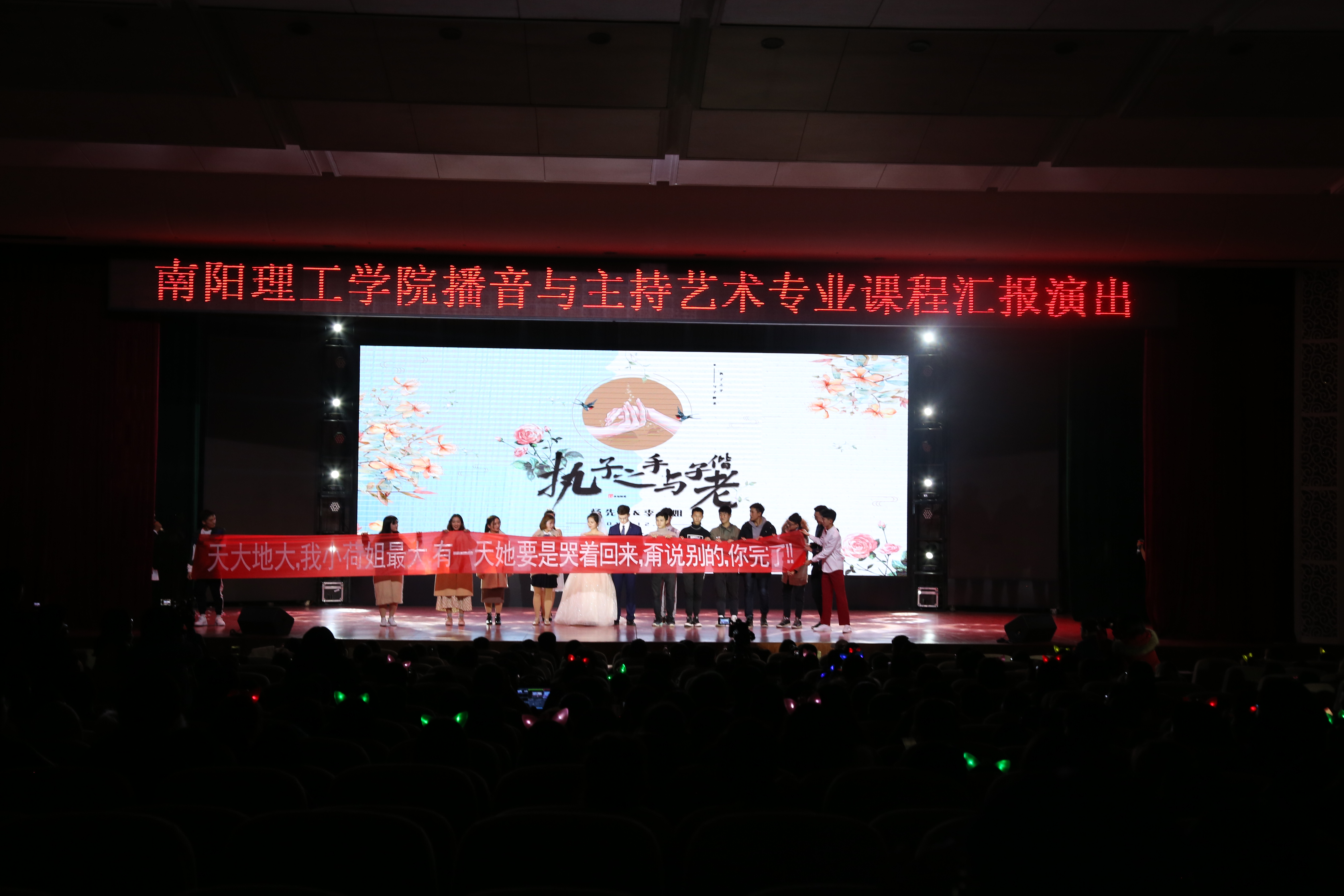 本网讯(学生记者/牛怡甜 陶朝胜 校对/朱彦瑾 吴娅茜)12月11日,南阳理工学院播音与主持艺术专业课程汇报演出于音乐厅顺利举行,八百余名学生观看本次演出。本次演出以婚礼秀的形式拉开序幕。爱情是爱的升华,婚姻是幸福的融合。杨成寅先生和李庆荷小姐的婚礼在伴郎伴娘精彩的走秀中正式开始,伴随着精彩的走秀,新郎分享了自己与新娘的爱情故事,让观众感受他们从校服到婚纱一路走来对爱的执着。