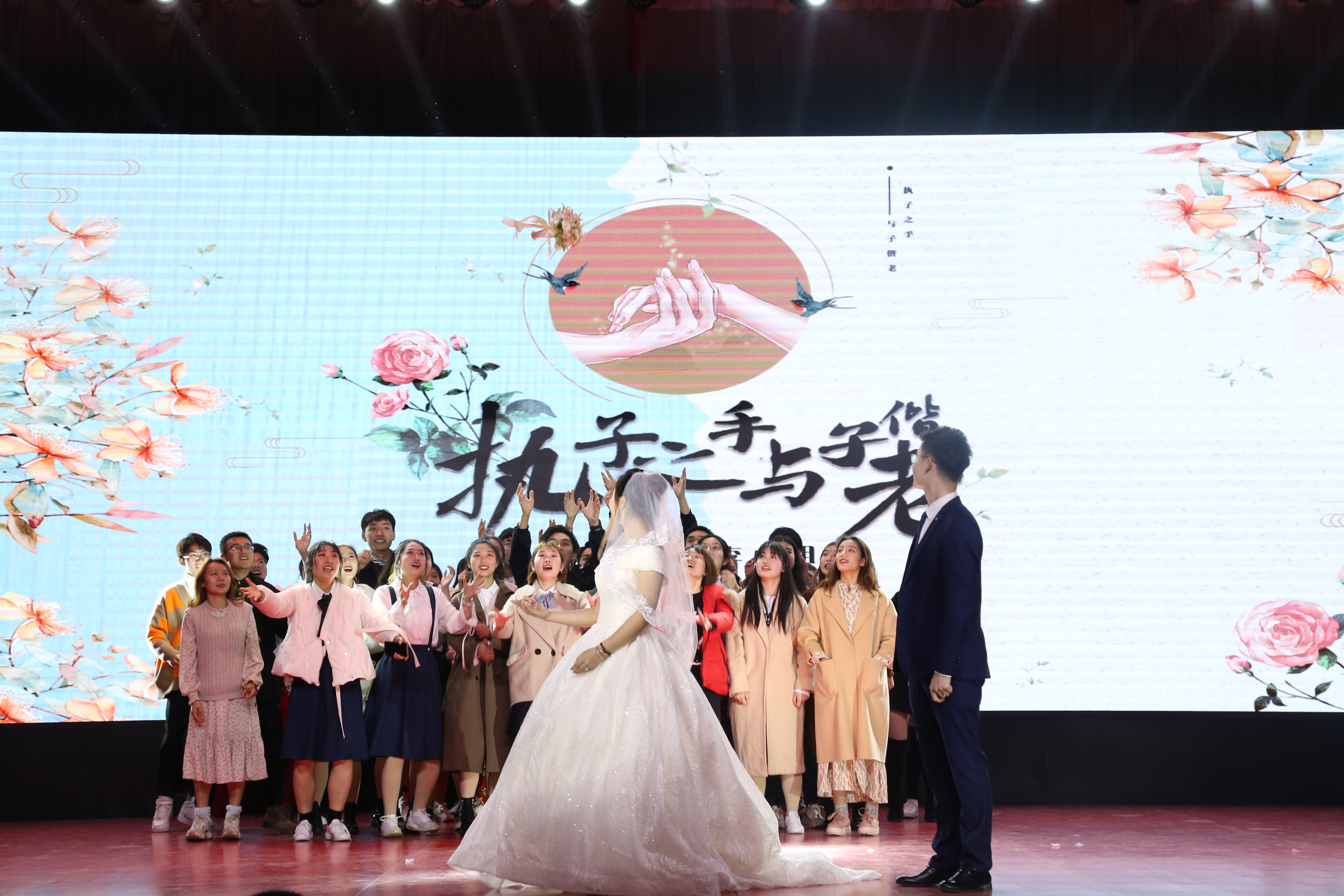 "肩负着家庭和社会的责任,孝敬父母,相亲相爱,白头到老",这是证婚人对新郎新娘的祝福,以此祝愿他们相亲相伴走过一生。新娘将象征美好祝福的手捧花抛了出去,抛出的不仅仅是花球,更多的是去传递这份幸福,现场的气氛被点燃,观众欢呼不断。