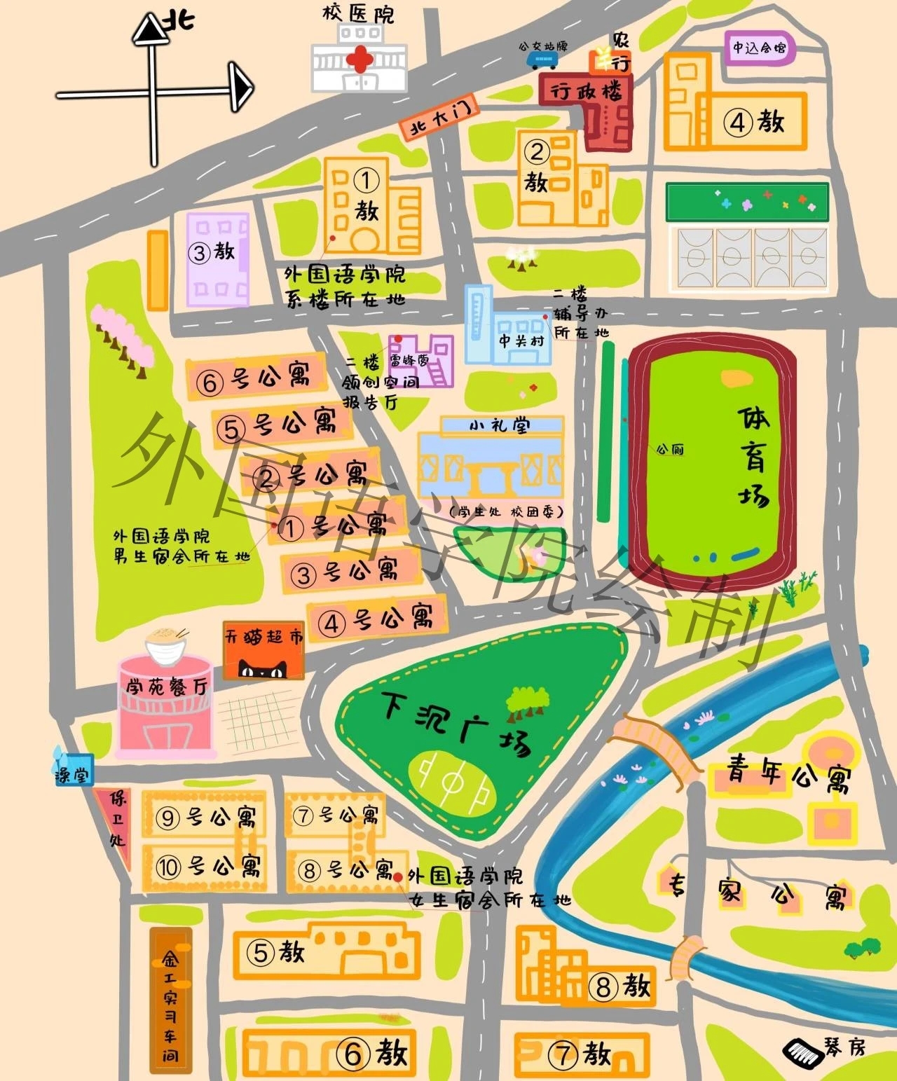 外国语学院学生会制作了手绘地图,手绘地图主要为老校区俯瞰图,地图上标注了外国语学院系楼位置以及新生所分配的公寓楼,还有学生日常需要前往的食堂、超市、操场等,手绘地图倾注了学长学姐对新生的关爱,让新生能够顺利报到。同时学院还召集了志愿者帮助新生搬运行李。外国语学院的日本外教永吉力也到场和学生志愿者一起迎接新生。