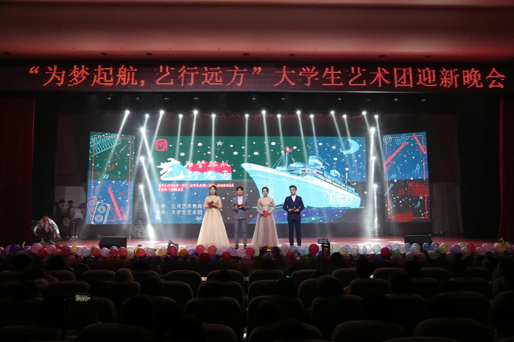 本网讯(学生记者/学通社 徐畅 皮家慧 马聪 校对/杨林松 叶煜坤)11月21日,由公共教育中心主办、大学生艺术团承办的“为梦起航,艺行远方”大学生艺术团迎新晚会在音乐厅顺利举行。艺术团指导老师高盼、31届艺术团团长王兴、32届艺术团三位团长金唯一、夏丕显、赵恒瑶及八百余名同学共同观看了本次晚会。