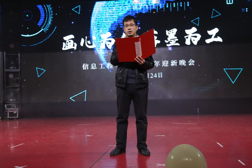 信息工程学院院长乔建良对在座人员致词,他对本次晚会的工作人员与演员们表达了感谢,总结了2020年信息工程学院工作,并表示了对信息工程学院的未来充满信心。