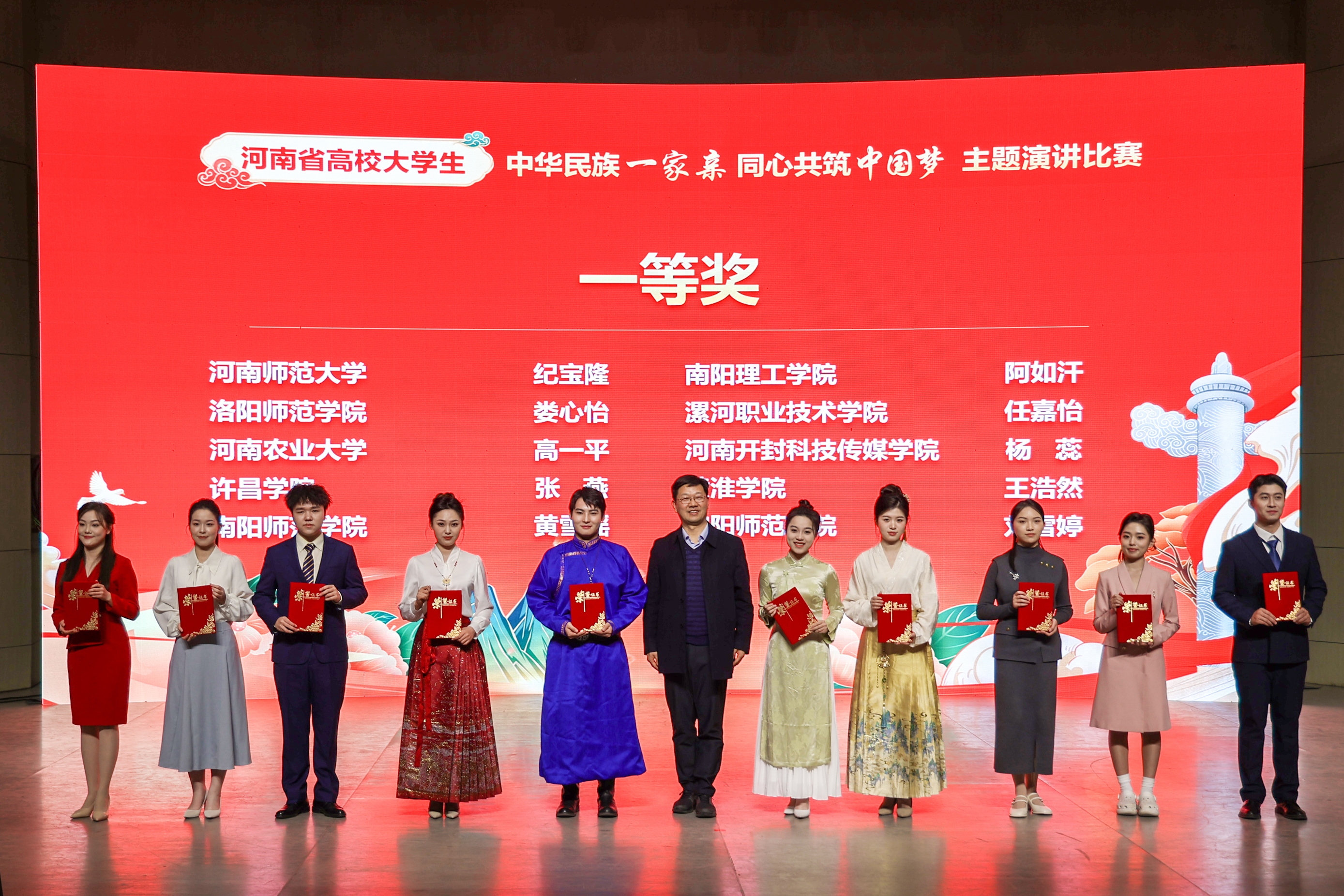本网讯(特约记者/马丹)12月4日,由中共河南省委教育工委、省教育厅主办,河南师范大学承办的全省高校大学生“中华民族一家亲,同心共筑中国梦”主题演讲比赛决赛在河南师范大学举行。我校传媒学院学生阿如汗凭借扎实的专业功底和出色的舞台表现脱颖而出,斩获一等奖。