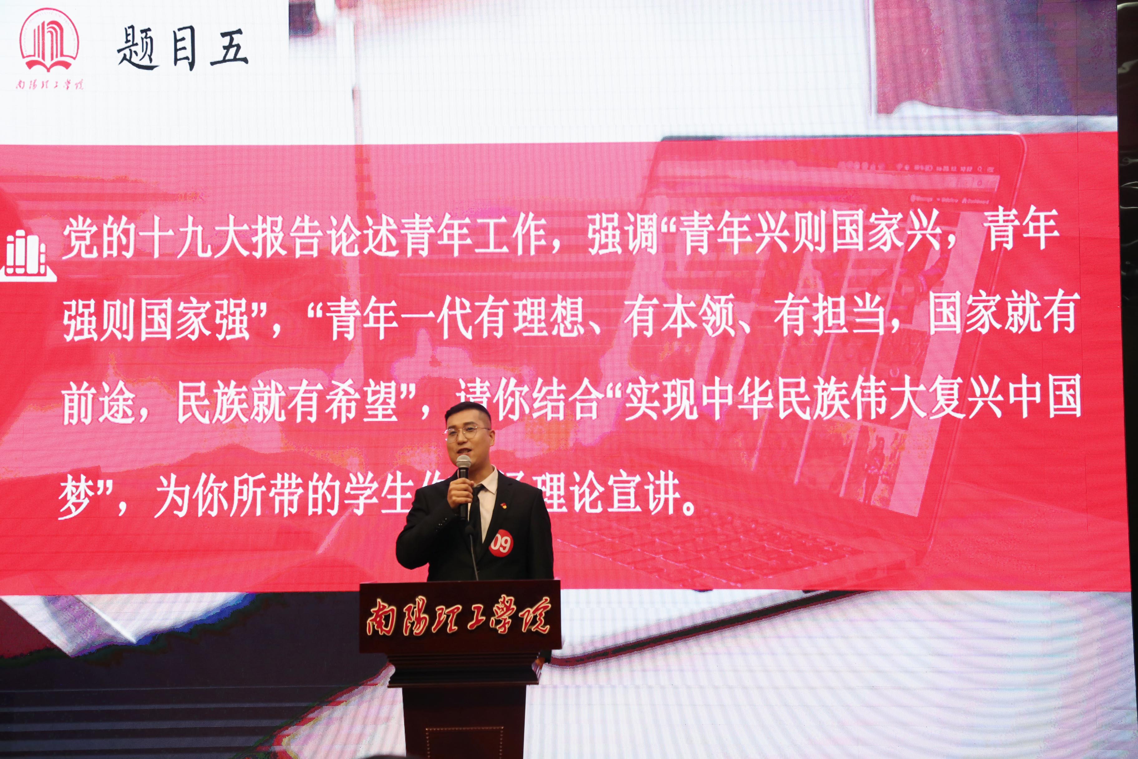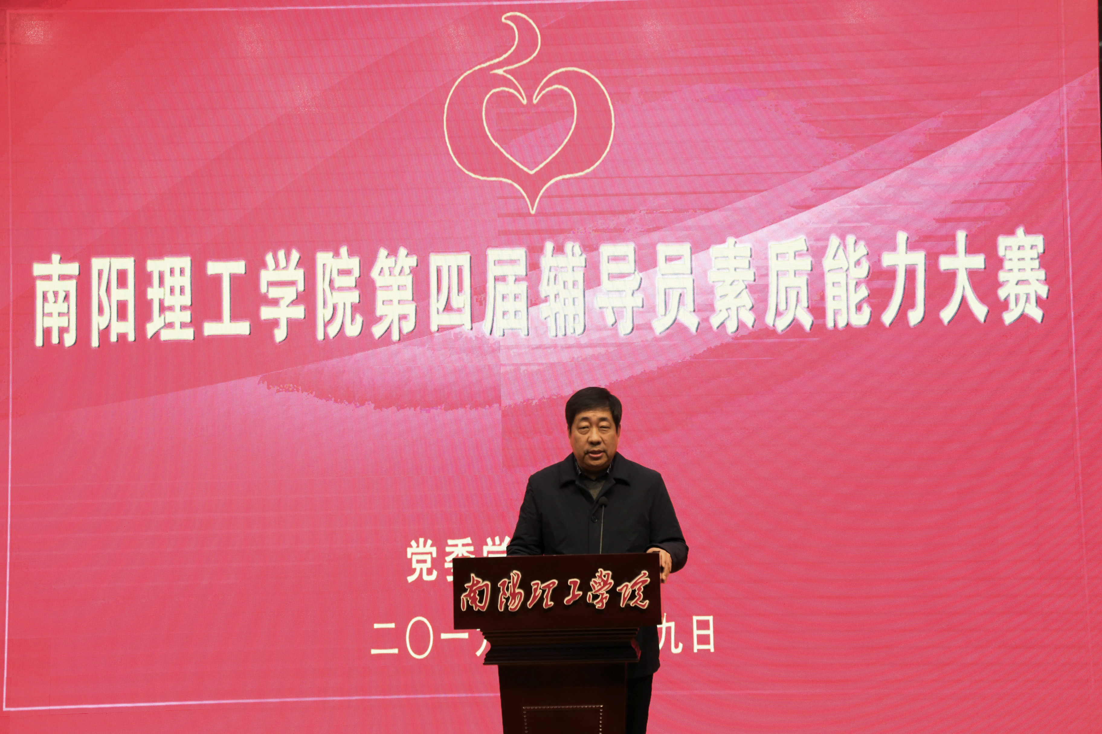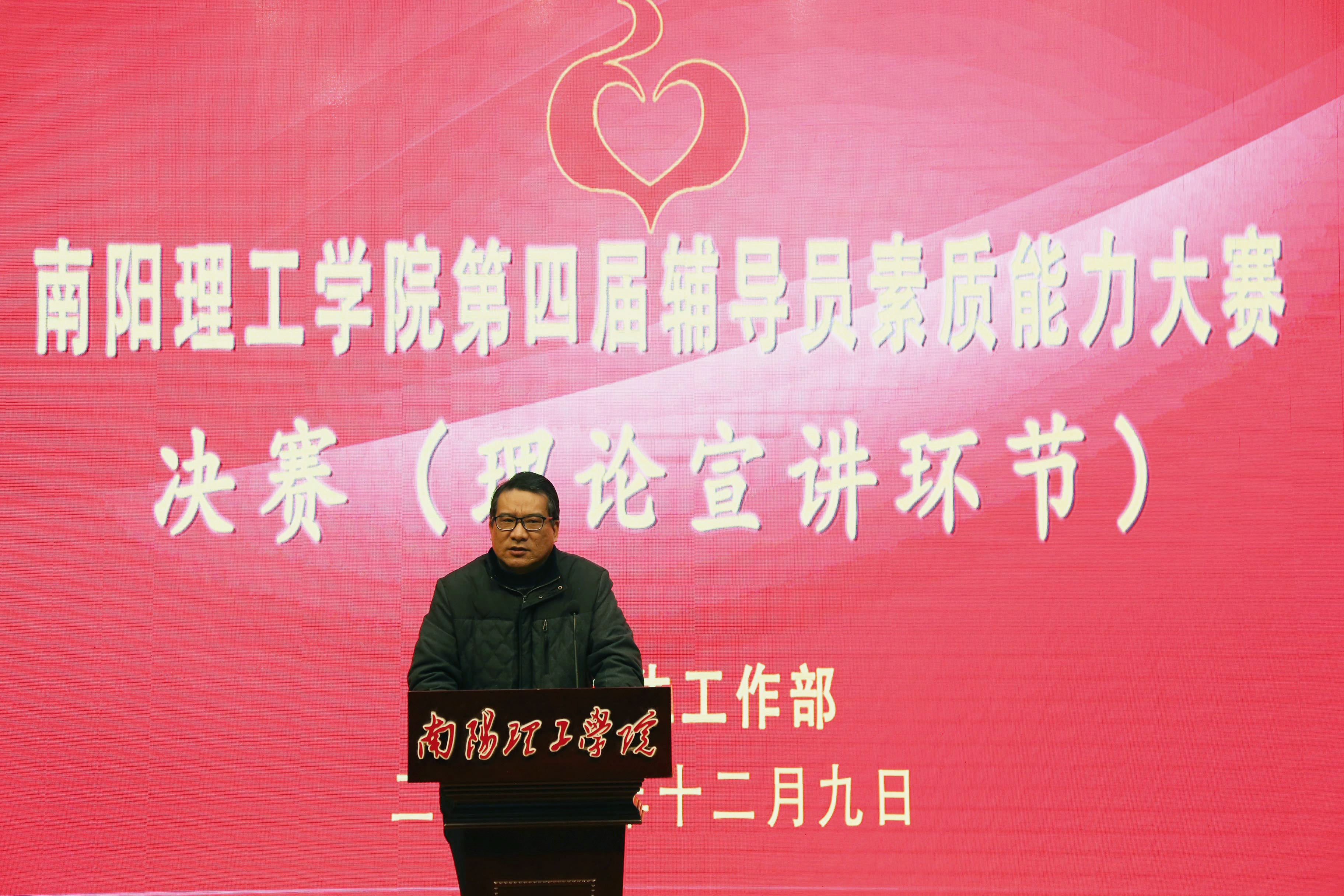本网讯(学生记者/钟慧娟 熊国辉 校对/魏凯瑞 张萌萌)12月 9日,南阳理工学院第四届辅导员素质能力大赛决赛(理论宣讲环节)在领创空间二楼报告厅顺利举行。校党委委员、副校长肖泽昌出席本次决赛,党委学生工作部部长、学生处处长路瑞峰同300余名师生共同观看了本次辅导员素质能力大赛决赛。本次大赛决赛由校党委委员、党委宣传部部长高芳放、纪委副书记、纪委办公室主任高林、发展规划处处长张洪峰、马克思主义学院院长葛晨光、图书馆馆长安新华、心理健康教育中心主任赵卫平、后勤管理与服务中心党支部书记何云亭担任评委。