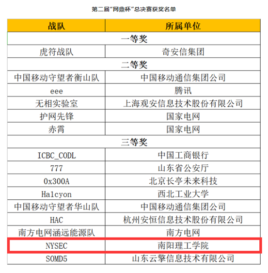 2020年第二届“网鼎杯”网络安全大赛集结来自全国各行业领域的14724支战队,报名参与人数高达50165人,覆盖全国各行业部门、科研机构、高等院校、网安企业、互联网企业以及社会力量等。历经四场官方资格赛、2000人超大规模线下半决赛的重重洗礼,50支精英强队统一在同时开启的AWD PLUS+网络靶场挑战双赛场中展开激烈角逐。经过8小时酣战,我校学子刘祥来、高旭东、杨舒茗、徐子易组成的NYSEC战队过关斩将,荣获大赛全国三等奖。