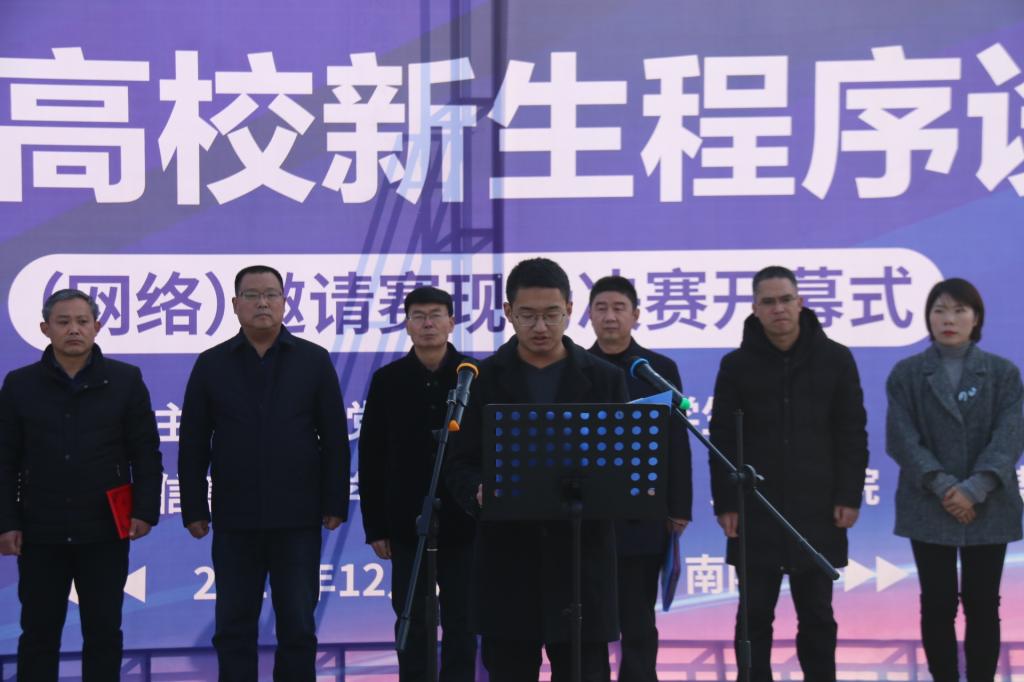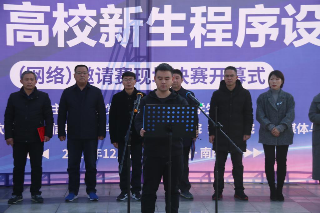 参赛选手代表、计算机与软件学院邵昱原代表全体参赛选手发言,他表示学校为学生们学习编程提供了良好的实操平台,并且培养了科技创新和团队合作能力,同时他也承诺在比赛中必将遵守纪律、遵守规则、团结协作、赛出风格、赛出风采。计算机与软件学院院长刘黎明教授宣布南阳理工学院首届省内高校新生程序设计大赛(网络)邀请赛现场决赛正式开幕。