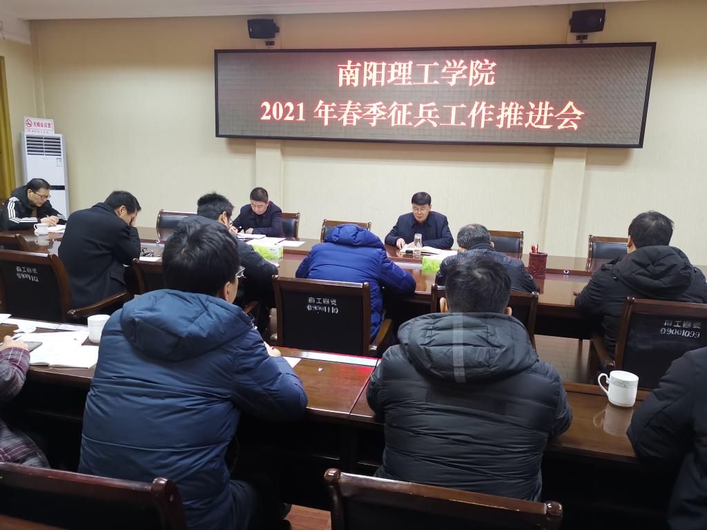 党委学生工作部、人民武装部部长路瑞峰传达了2月3日南阳市2021年征兵工作推进会的会议精神,并就我校下一步征兵工作安排做了详细部署,他要求各教学院要提高思想认识,克服畏难情绪,主动出击,精准动员,确保高质量完成大学生应征入伍征集任务。党委学生工作部、人民武装部副部长田永磊通报了目前我校学生应征入伍预征报名和体检情况,并对2021年各教学院大学生征兵工作任务分解做了详细的解读。