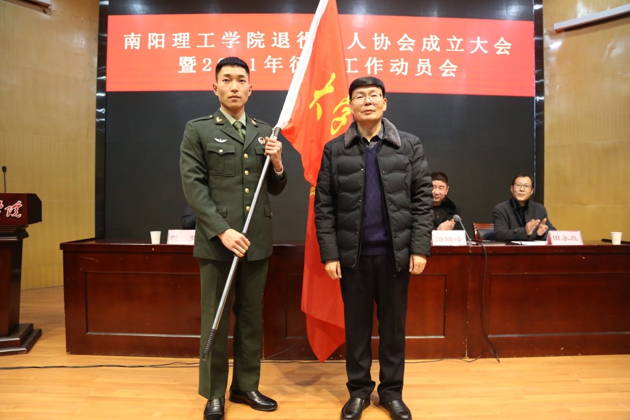 大会在雄壮的国歌声中拉开序幕。校团委副书记程斐宣读《关于成立南阳理工学院大学生退役军人协会的决定》,张伟向大学生退役军人协会授旗。