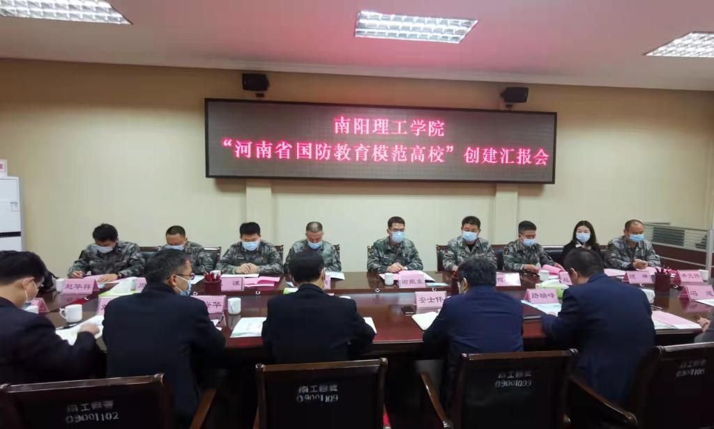 本网讯(特约记者/王吉春)11月5日,南阳军分区到我校考核“河南省国防教育模范高校”创建工作。南阳军分区政治委员谢振东、政治工作处主任何名享,宛城区区常委、人民武装部政委杨小炳,宛城区人民武装部部长赵耕,校长安士伟,校党委副书记、工会主席张伟及南阳市教育局、镇平县人民武装部等考评领导小组成员出席汇报会,我校相关部门负责同志及部分教学院书记参加。汇报会由学生工作部、人民武装部部长路瑞峰主持。