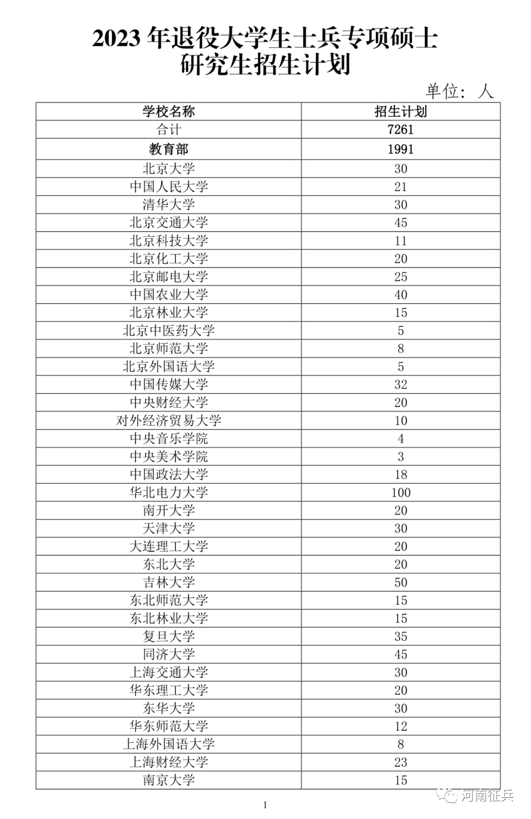 一、2023年全国“退役大学生士兵计划”由北京大学、清华大学等513所普通高等学校承担(具体计划附后)。该专项计划在全国硕士研究生招生计划总规模内单列下达,专项计划专项使用,不得挪用,不得调整为普通计划。